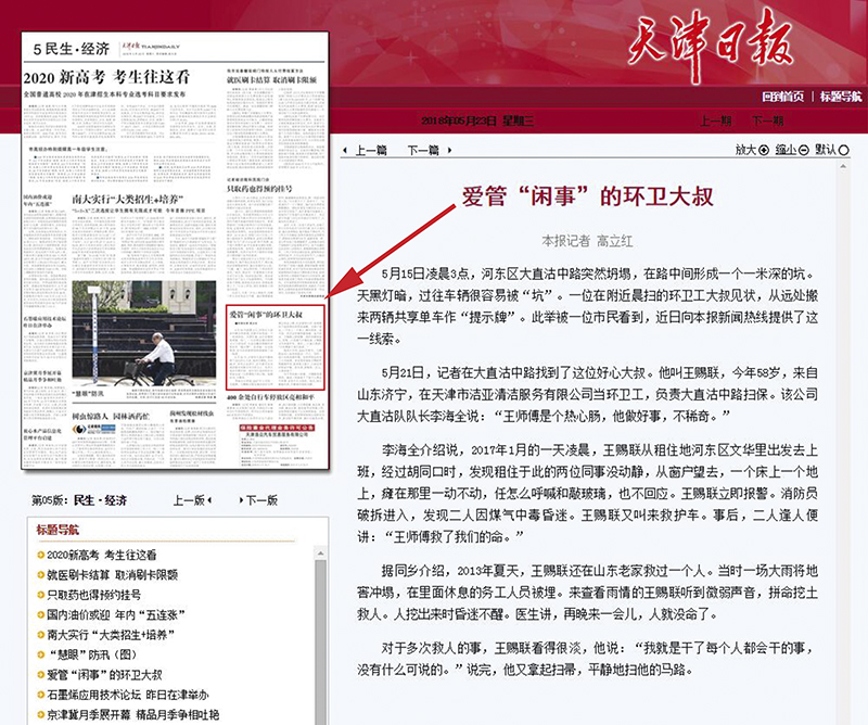 “大道之行,天下为公”,多年来,okpay钱包公司一直致力于公益事业,先后成立okpay钱包党支部、团支部、工会、义工服务小组、志愿者队伍等组织,从上到下,力所能及地为社会贡献自己的一份力量,不断涌现出见义勇为、好人好事, 这不,天津市okpay钱包清洁服务有限公司又有一位爱管“闲事”的环卫大叔,天津日报、天津市场信息报、新华网、人民网、北方网、大众网等主流媒体相继报道了此事,原文如下: